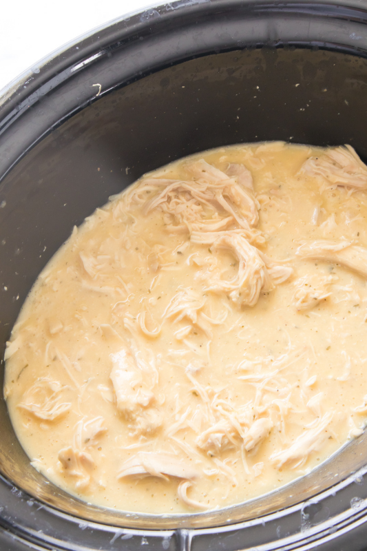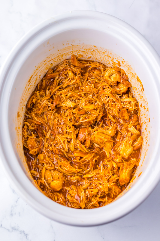 Take the chicken out of the slow cooker, shred it using two forks, then return it to the sauce and stir to combine.