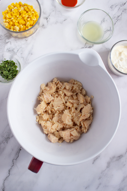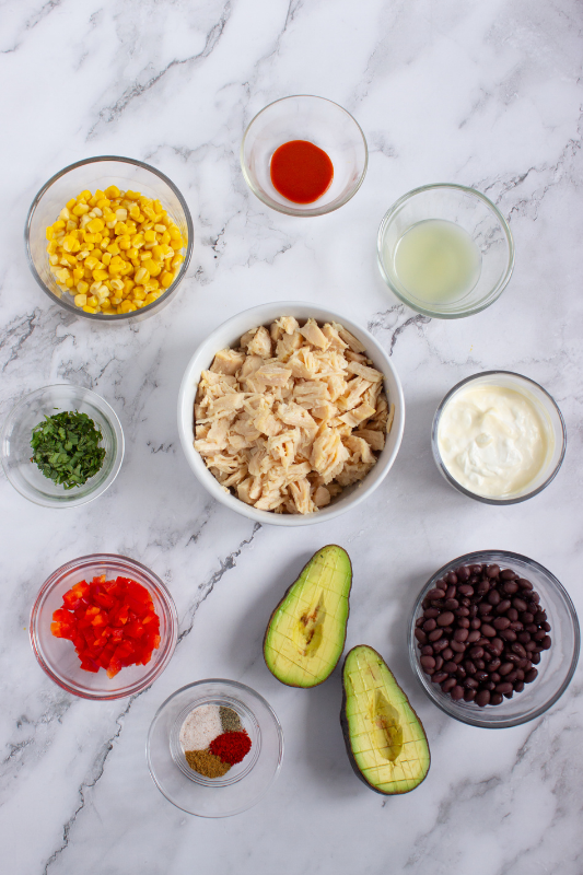 - Add the chicken, corn, beans, red bell pepper, cumin, paprika, salt, pepper, avocado, lime juice, mayo or Greek yogurt, parsley, and hot sauce to a large bowl.