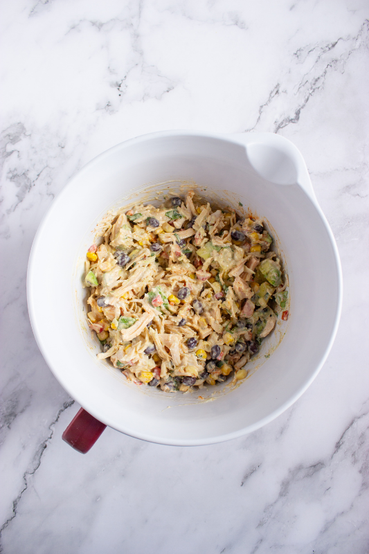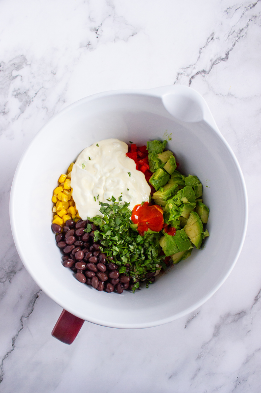 Step 1: Add the chicken, corn, beans, red bell pepper, cumin, paprika, salt, pepper, avocado, lime juice, mayo or Greek yogurt, parsley, and hot sauce to a large bowl.