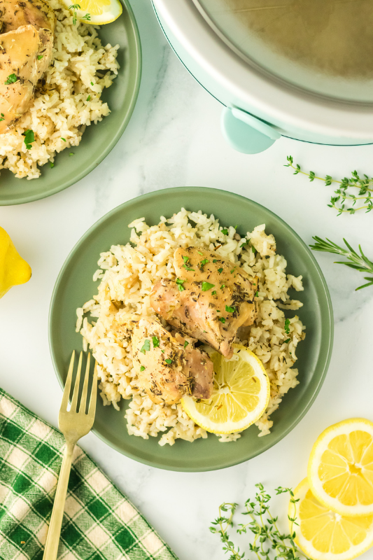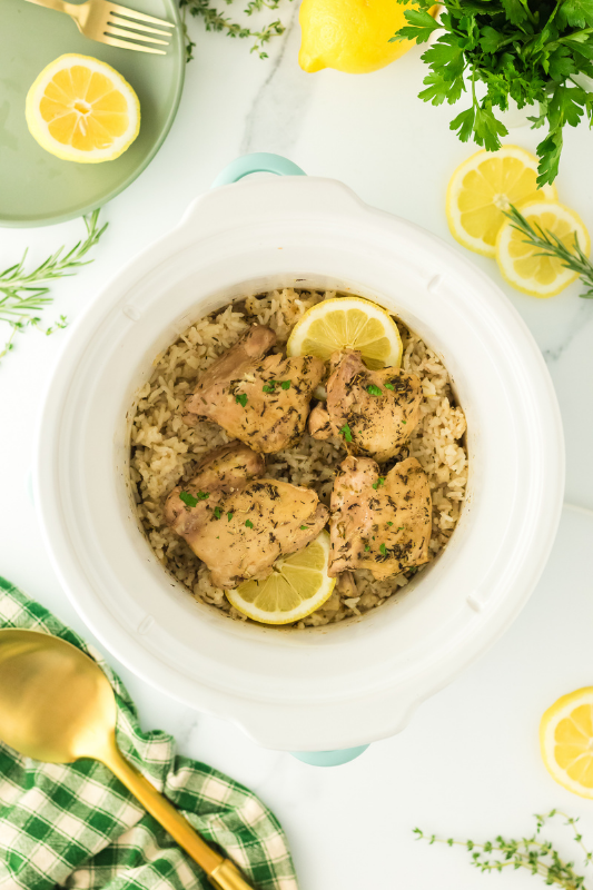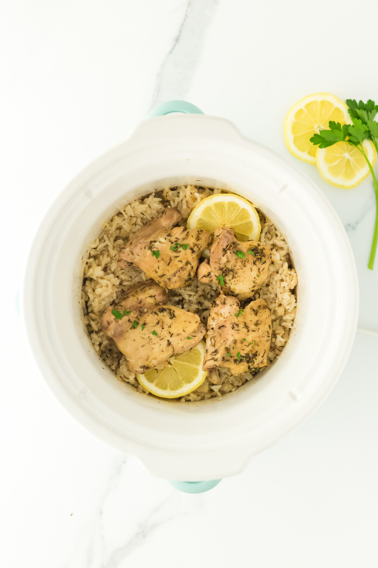 Yes, you can cook rice right in the slow cooker with chicken as long as there’s enough liquid. In this recipe, the chicken broth helps the rice cook slowly while soaking up all the lemon and herb flavor.