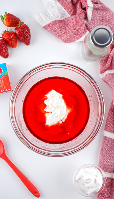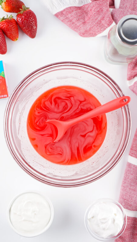 - Add the yogurt to the bowl and use a whisk to gently combine it with the jello.