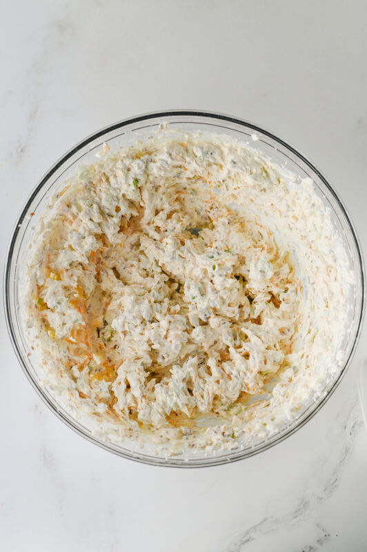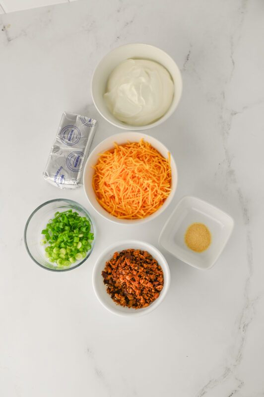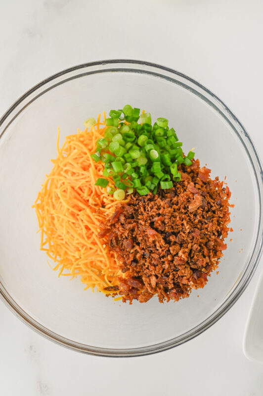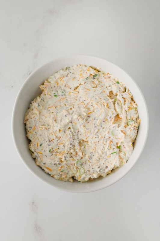 - In a large mixing bowl, combine the cream cheese, sour cream, shredded cheese, bacon bits, green onions, and garlic powder.