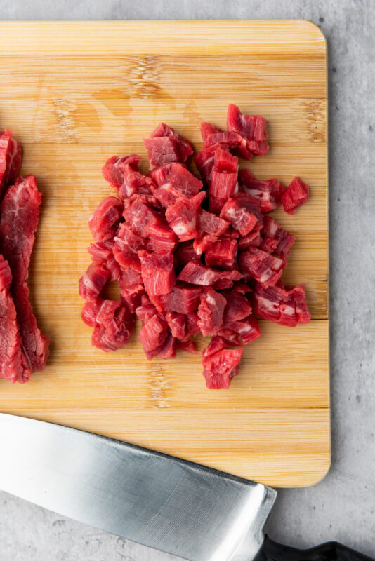 - Slice the flank steak thinly against the grain, then cut it into small pieces. Place the steak in a bowl.