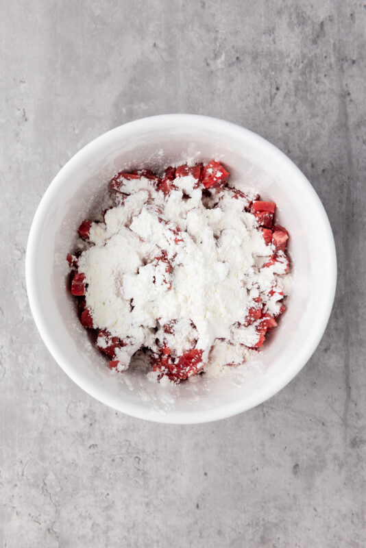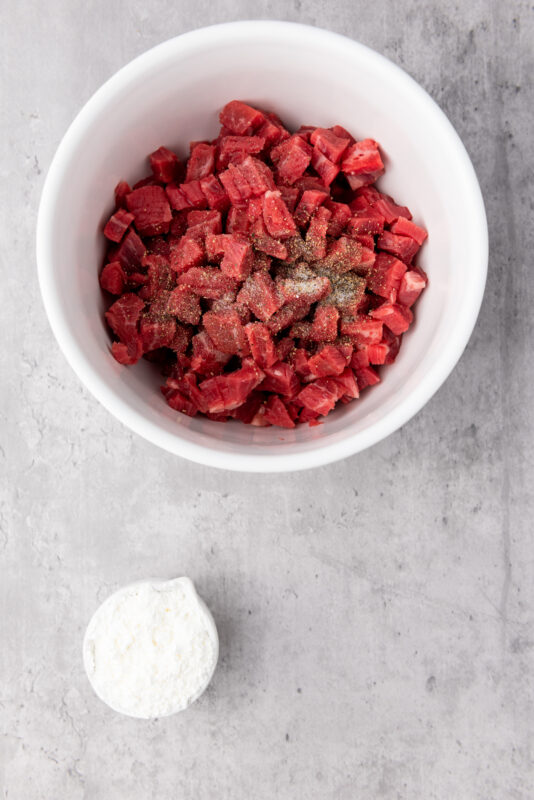 2. Season the steak with salt and pepper, then coat it with cornstarch. Toss until the steak is evenly coated.