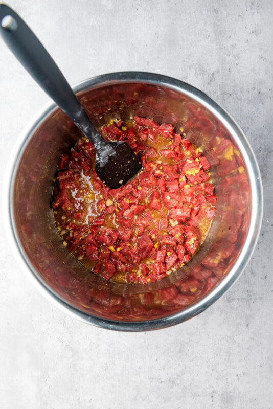5. Next, add the minced garlic, ginger, brown sugar, sesame oil, soy sauce, and water. Stir until everything is well mixed.