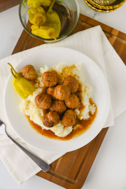 These crockpot Mississippi meatballs are rich, savory, and incredibly easy to make. Frozen meatballs slow cook in a buttery, tangy sauce with ranch seasoning, au jus, and pepperoncini for a comforting dish that works just as well for busy weeknights as it does for parties and game day.